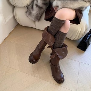 牛革バージョン~レトロベルトバックルミッドカーフブーツレディース厚底スリムブラウンブーツ大筒ハイライダーブーツ