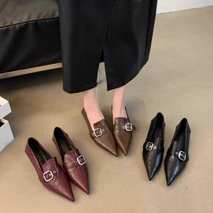 潮牌2025秋季皮带扣低跟尖头单鞋女气质软皮踩跟猫跟中跟小皮鞋