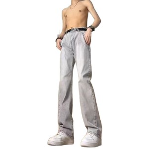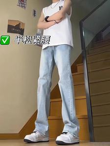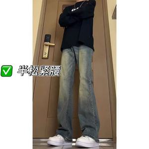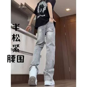 美式水洗烟灰色弹力牛仔裤男女夏季半松紧宽松直筒微喇长裤休闲裤