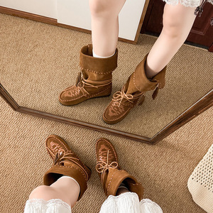 Sudingjia タッセルストラップ編み込みウエスタンブーツ女性用、スリムで内側が高くなるパイルブーツ、折りたたみ可能なミッドカーフマーティンブーツ