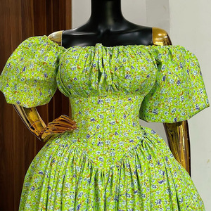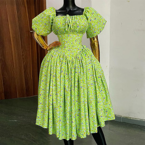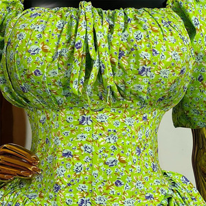 ヨーロッパとアメリカのクロスボーダーレディース2025夏新作小花柄ストラップハイウエストグリーンミドル丈ドレス