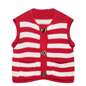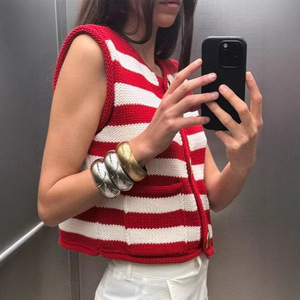 Amazonクロスボーダー春秋新作ニットベストレディース万能ストライプラウンドネックノースリーブセーターベストトップ