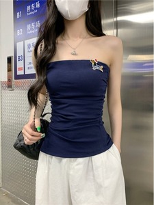 デザインプリーツネイビーブルーチューブトップ女性の夏の2025新しいスリムフィットショートホットガールアウタートップトレンディ