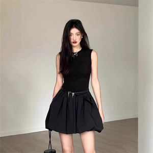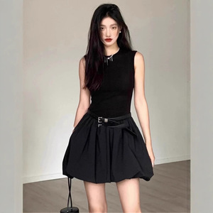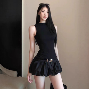 ホットガールスリムノースリーブベストブラックAラインドレスレディースサマーショートデザインバックレスフラワーバドチュチュスカート