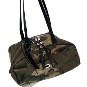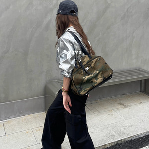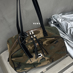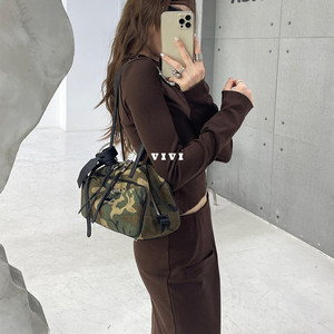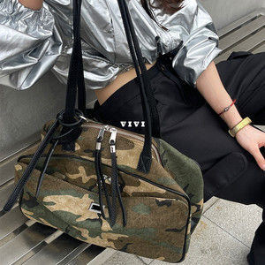 小众韩系潮酷皮带扣迷彩布翻盖托特包女2025新款保龄球单肩手提包