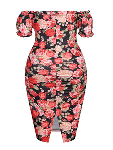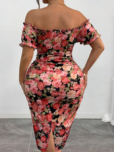 新款跨境欧美印花紧身包臀褶皱设计一字肩修身优雅大码女士连衣裙