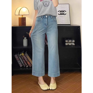 浅色直筒牛仔裤女夏季薄款大码胖mm高腰显瘦小个子宽松九分阔腿裤