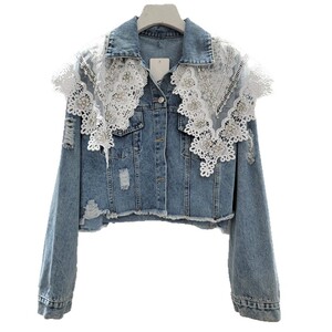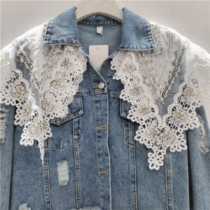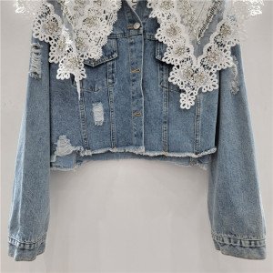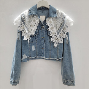 设计感小众重工钉珠镶钻蕾丝拼接花边甜美牛仔长袖宽松木耳边外套