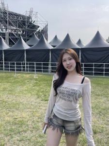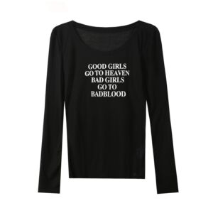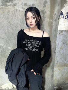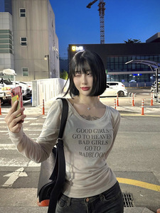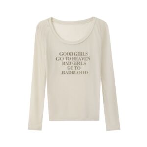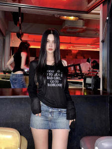 Badblood レタープリント やや透け感のある長袖ボトムシャツ オフショルダー アメリカンレイジースタイル ローラウンドネック Tシャツ レディース スリムフィット
