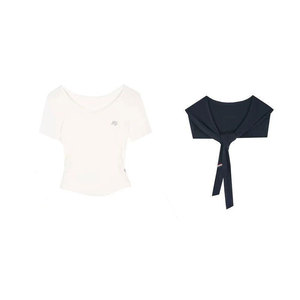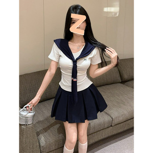 韓国カレッジスタイルネイビーカラートップスーツレディース春デザインニッチ半袖Tシャツハイウエストスリムプリーツスカート