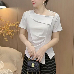 【5135人】イレギュラースリット半袖Tシャツ2025夏新作メッシュパッチワークウエストゆったり着痩せ