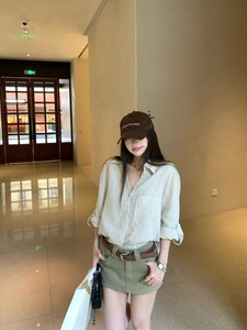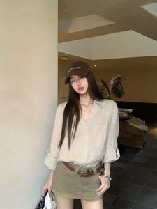 ポロラペル長袖リネンシャツ女性の夏フレンチスタイル日焼け止めカーディガンジャケットルーズトップ