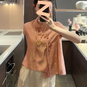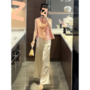 新しい中国風の女性のための中国風スーツ 2025 夏の新しいレトロなボタン付きトップハイウエストストレートワイドレッグパンツ 2 点セット