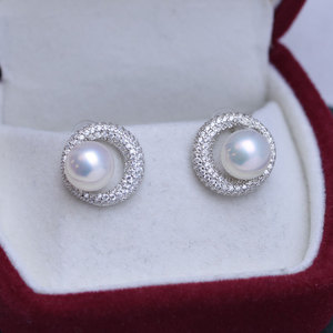 淡水8-9mm正圆强光细微瑕白色珍珠耳钉S925银月牙满镶耳饰批发供