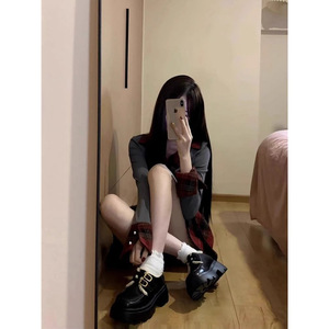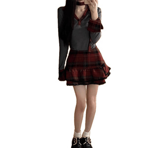 アメリカンスイートガールチェック柄ツーピーススーツ女性初秋カレッジスタイルスプライシング長袖トップとふわふわスカートスーツ