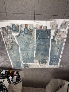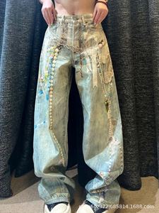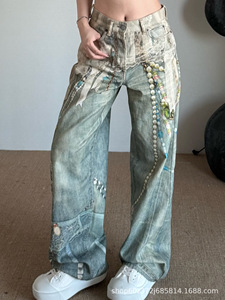 高品25早秋新款小众设计蕾丝珍珠链条3D立体印花做旧直筒宽松牛仔