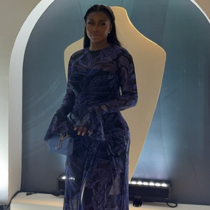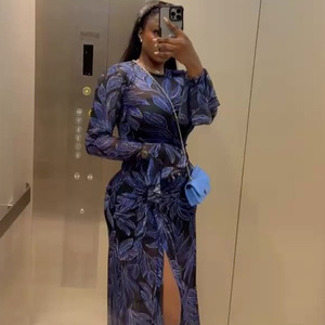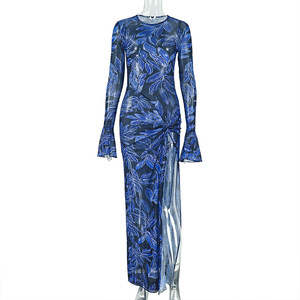 欧美风外贸优雅通勤女装圆领开叉连衣裙喇叭袖微透修身不规则裙潮