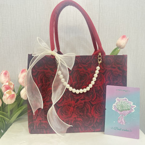红玫瑰加扣子+珍珠挂件+网纱飘带;帆布;尺寸30x22x12
