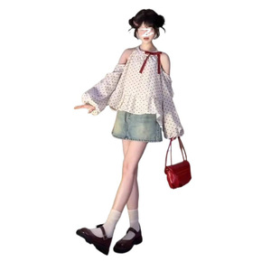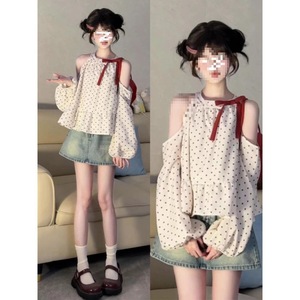 大码甜美波点长袖衬衫女春季新款设计感蝴蝶结衬衣宽松露肩上衣服