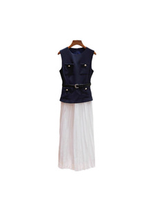 SP フレンチスタイルの小さな香りの偽ツーピースマイクロプリーツロングスプライシングラウンドネック A ラインベルトベストドレス女性用