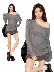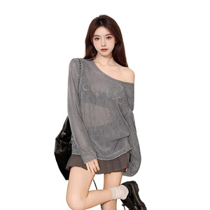 美式辣妹灰色斜肩露肩长袖t恤女夏宽松薄款针织镂空防晒罩衫上衣