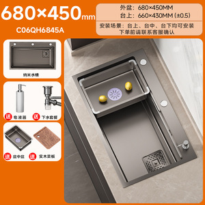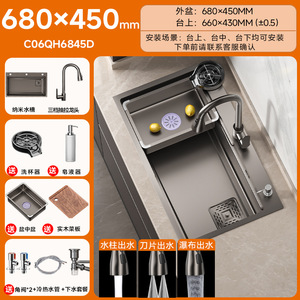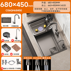 【纳米抗菌槽】枪灰68x45cm+菜板+盆中盆+四档飞雨龙头+洗杯器+净水龙头