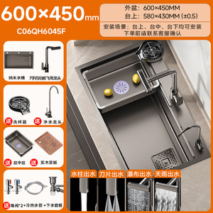 【纳米抗菌槽】枪灰60x45cm+菜板+盆中盆+四档飞雨龙头+洗杯器+净水龙头