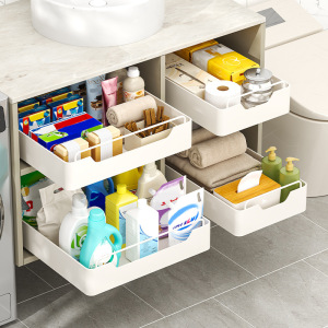 バスルームキャビネット下の収納ラック、シンク下のプルアウトバスケット、バスルームシンクキャビネットの下のプルアウト収納ボックス、レイヤードラック
