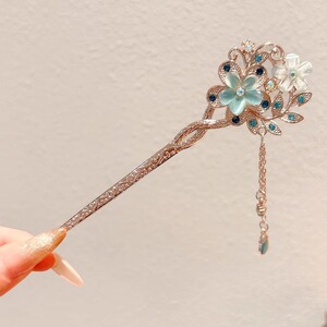 73#三花水钻珍珠金叉流苏发簪-金色 (袋装)