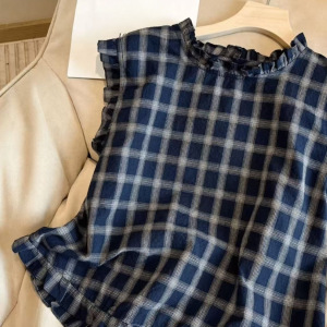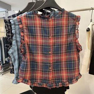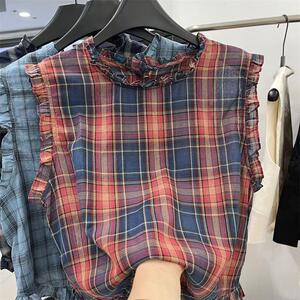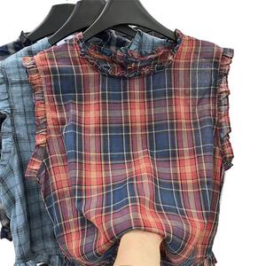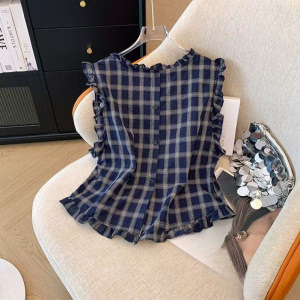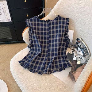 2025夏季新款百搭复古夏季显瘦格子印染无袖薄款衬衫荷叶边