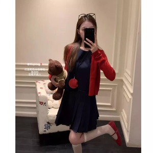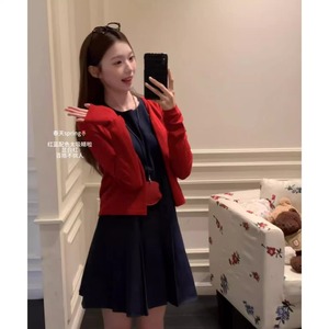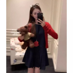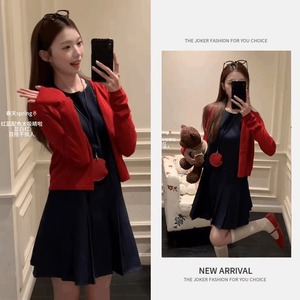 时尚气质穿搭女装新款韩剧显瘦红色针织开衫牛仔连衣裙两件套装潮
