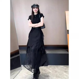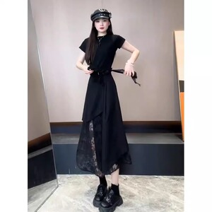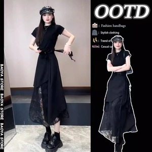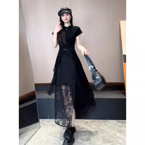 今年流行一整套穿搭女蕾丝拼接圆领短袖不规则网纱半身裙两件套装