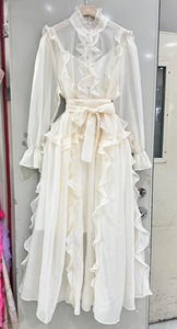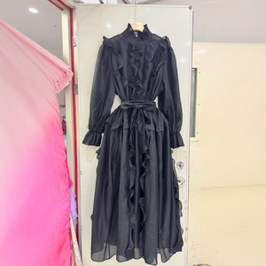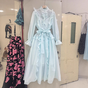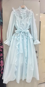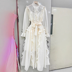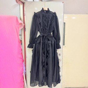 2025春夏新款单排扣长袖木耳边宽松气质法式优雅长裙连衣裙配腰带
