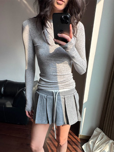 美式复古薄款羊毛天丝圆领长袖T恤女修身显瘦亲肤质感弹力打底衫