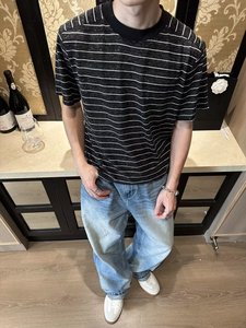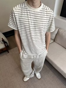 香港スタイルのシックなトレンディなコントラストストライプ半袖Tシャツメンズ夏の新しいトレンディなブランドルーズカジュアル多用途ラウンドネック半袖