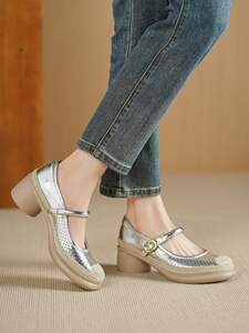 法式软羊皮镂空透气浅口单鞋女真皮夏拼色一字带玛丽珍鞋粗跟高跟