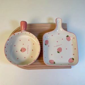 電子レンジ対応皿とボウル 北欧風皿ハンドル イチゴ手描きハンドル 陶器食器 グリルパン 蒸し卵ボウル なし