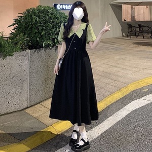 プラスサイズの女性の新しいスタイルの女子学生フレンチウエストファットmm偽ツーピースドレス半袖スリムスカートロングスカート