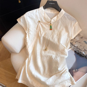 新しい中国風ジャカードボタンスタンドカラーフライングスリーブシャツ女性のための 2025 夏プリーツウエスト痩身トップ