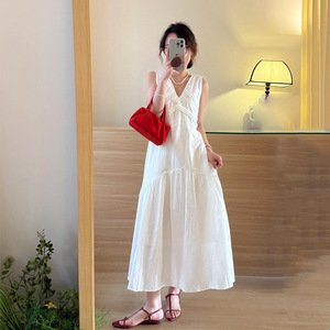跨境2025夏季新款设计感小众度假温柔风白色亚麻无袖v领连衣裙女