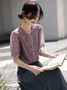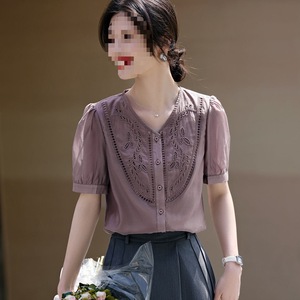 ファッショナブルでエレガントなヘビーウェイト刺繍シャツ女性の夏の新しいシングルブレストデザイン通勤多用途トップスプライシング
