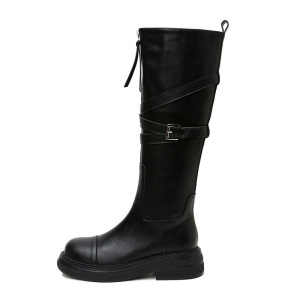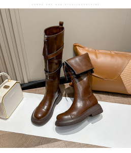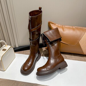 牛革バージョン〜秋メイラードレトロ牛革プラスベルベット厚底ハイライダーブーツレディース冬ミドルブーツ