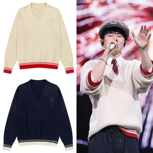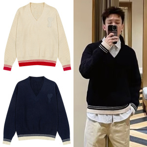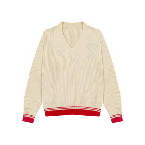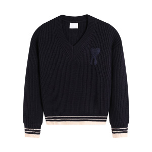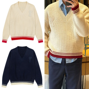 AMI ANCIENT ユニセックス ウーブンストライプ Vネックセーター 刺繍 ラブテキスト マイクロラベル セーター トップス
