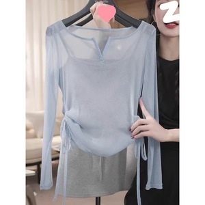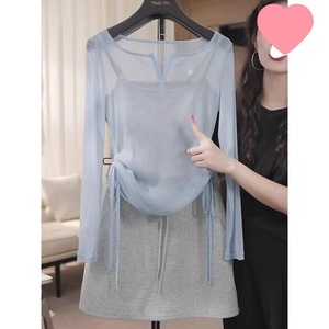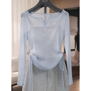 2025夏季洋气V领防晒长袖t恤女抽绳收腰显瘦遮肉百搭上衣罩衫女潮