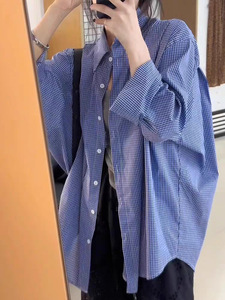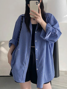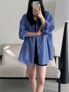 韩系蓝色格子衬衫外套女早秋穿搭新款学院风宽松叠穿上衣休闲衬衣
