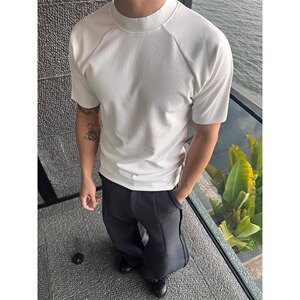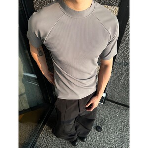 シンプルな小さなネックライン半袖メンズ夏アメリカンハーフタートルネックヘビーフィットネスショルダーTシャツテクスチャードスリム半袖