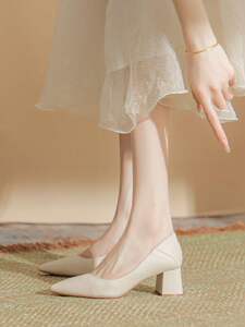 法式裸色高跟鞋女2025年新款气质软皮5厘米不累脚粗跟浅口单鞋女