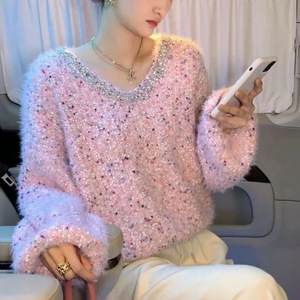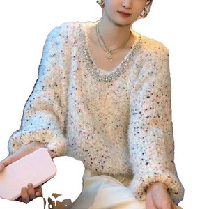 韩版钉珠彩色波点拼接软糯毛衣女秋冬新款慵懒风时尚气质长袖上衣