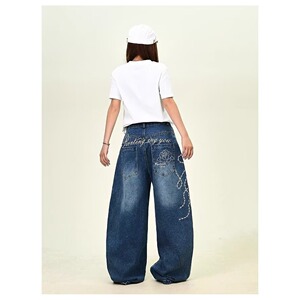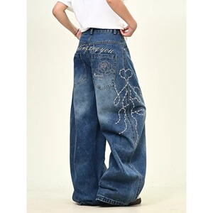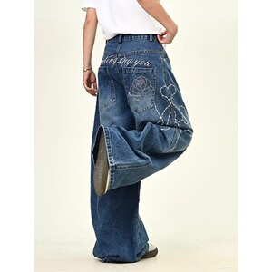 原宿时尚ins玫瑰刺绣阔腿弯刀牛仔裤男女拖地无品牌气质新款流行