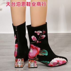 2025年欧美时尚秋冬新款现货刺绣中跟女皮靴外贸大码一脚蹬粗跟靴